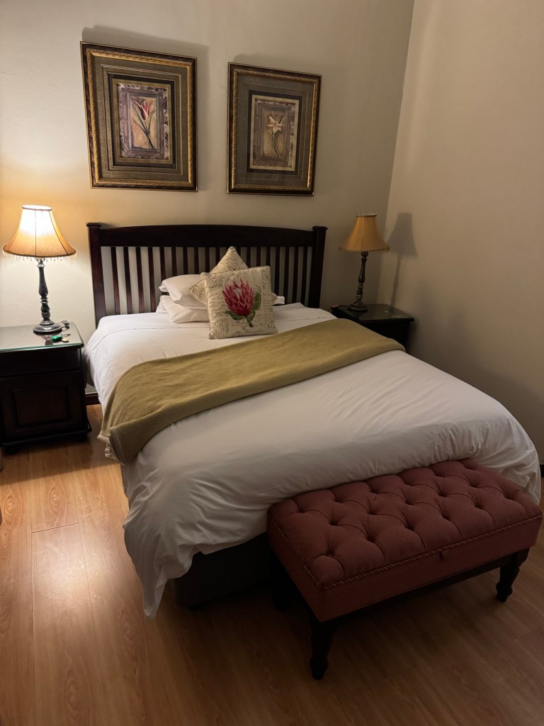 After a short visit, we headed to the Dunvegan Execu Lodge for the night. It was quite the charming stay. There was great security (there is a locked and gated entry), and it was delightfully quaint with only eight rooms for the entire place. Once inside my room, I spent some time figuring out how to heat the room (it’s winter in July), and I used my South Africa adaptor to charge all my technology (which included a watch and phone). Then, it was lights out for me. I was exhausted.