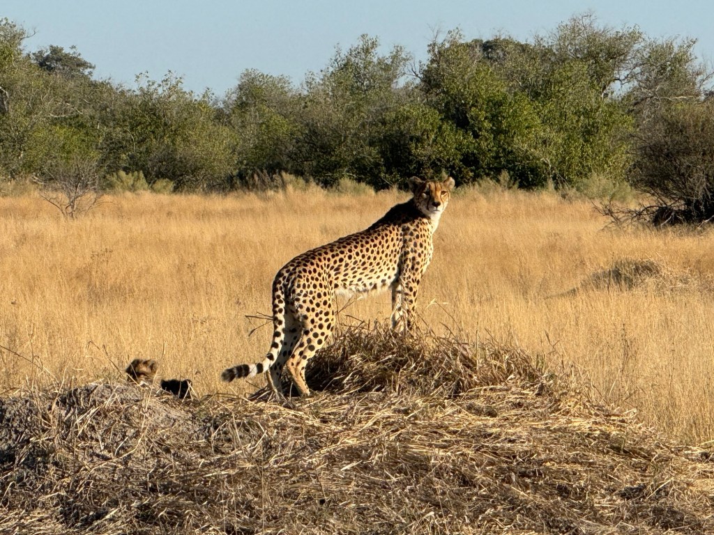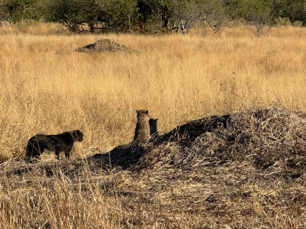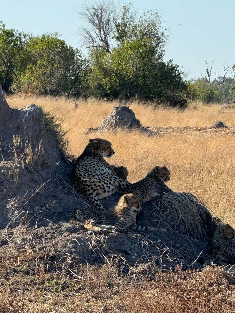 When the cheetah would move to another mound, we would take off to follow the family. Driving to the other side of the field let us discover mom and babies ready to rest. The termite mound they found had enough shade to keep them cool, and it provided enough shelter to help mom in case of an emergency.