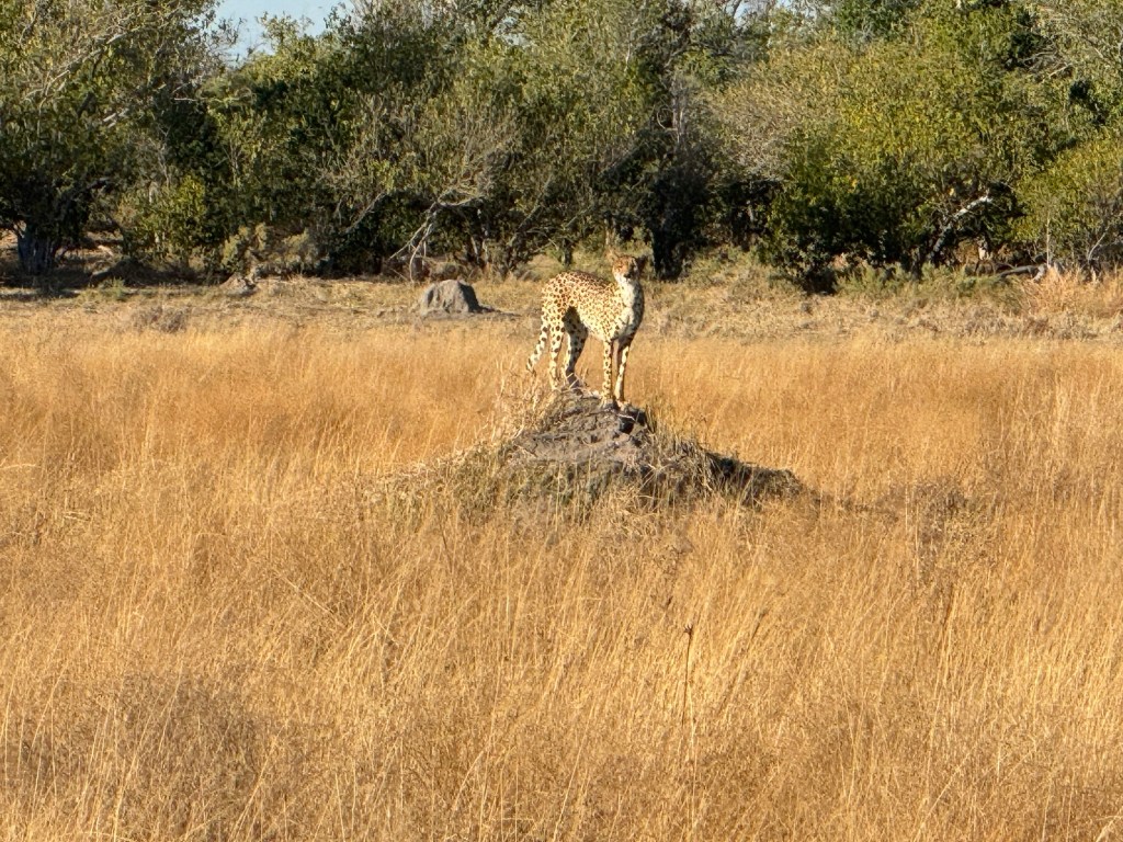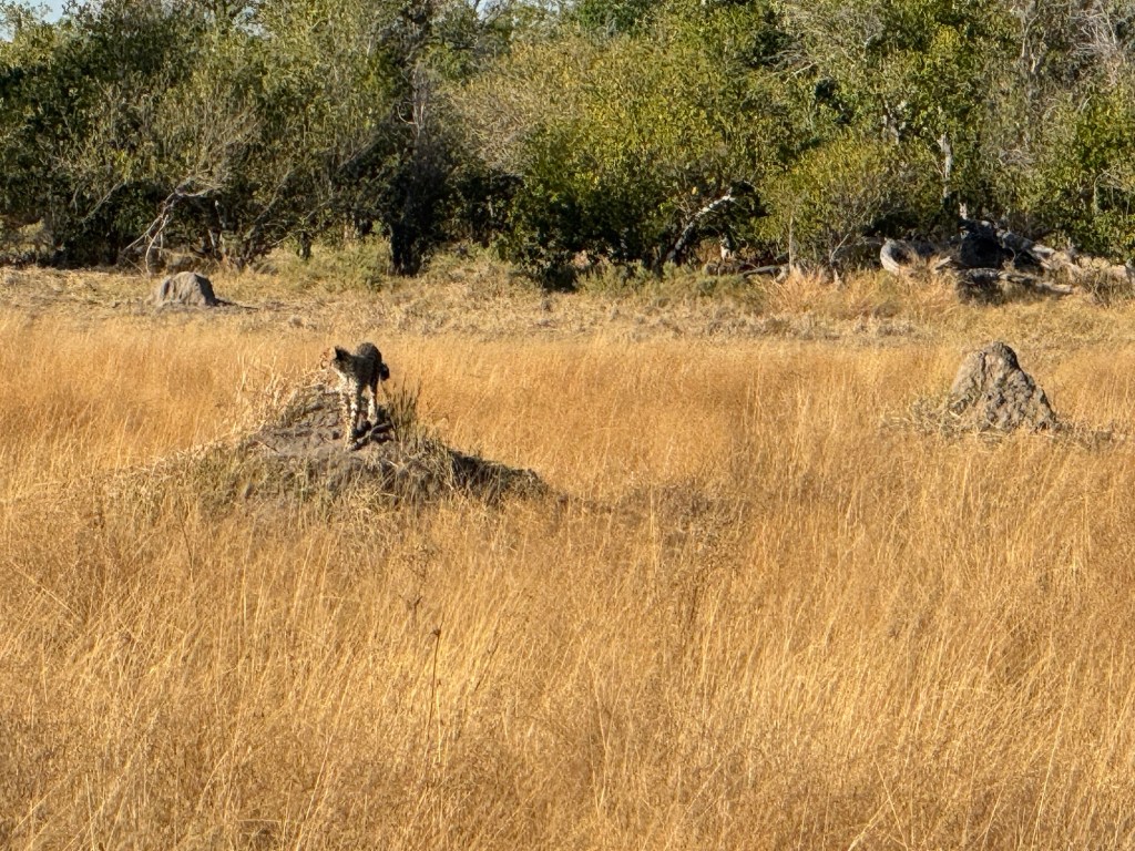 While we were watching the lions, Scotty (our guide) was talking with another vehicle’s guide. They mentioned a mother cheetah and her four babies. Intrigued, Scotty decided to set off to find these animals. We drove around for about fifteen minutes then found another Safari vehicle stopped in front of a field. As we approached the vehicle, that driver silently pointed to the movement in the grass. I pulled out my binoculars, and there before me was a cheetah.
