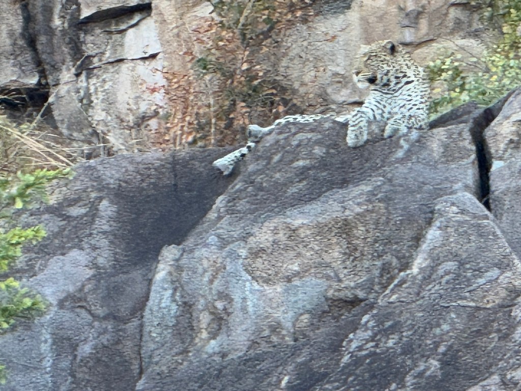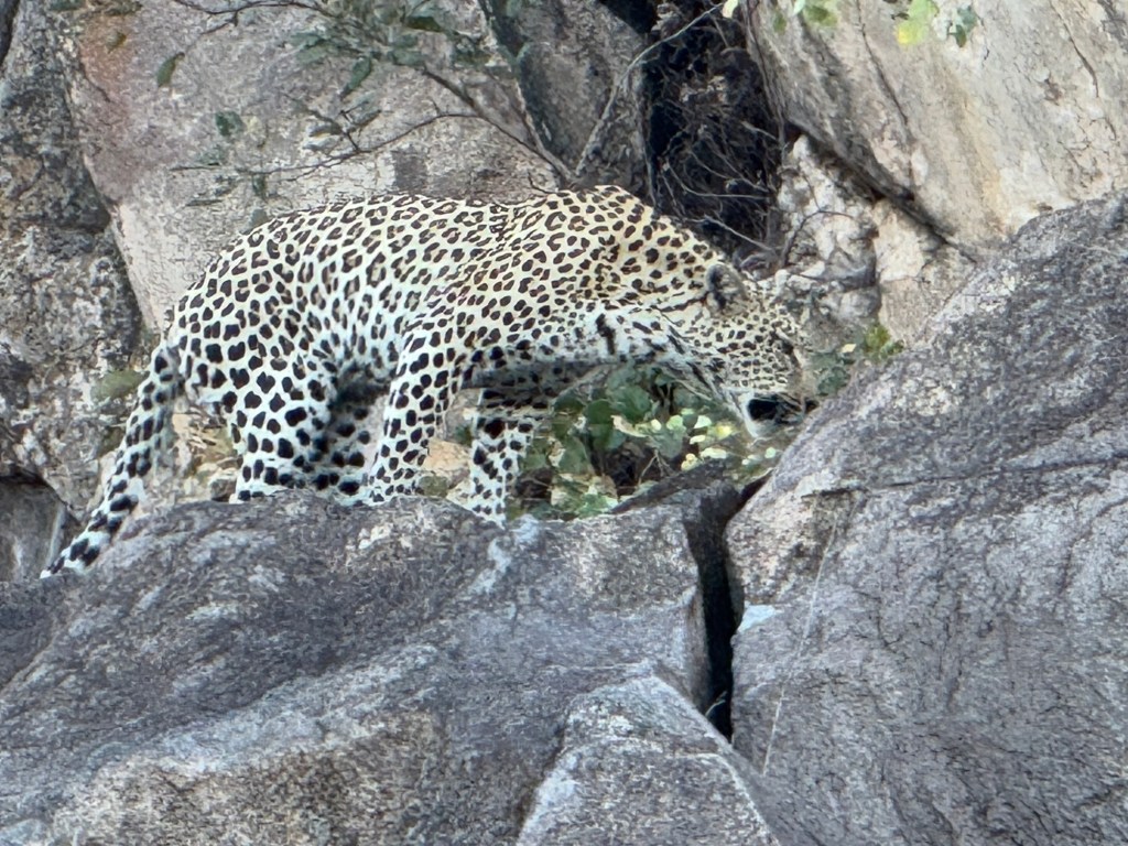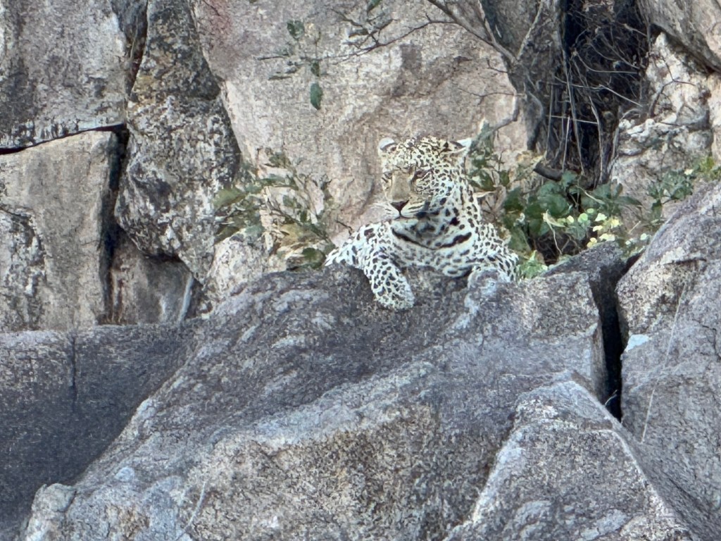 After some searching, we saw her laying lazily on the edge of the cliff. Her pose couldn’t have been more perfect–feet dangling over the edge as she sat atop the rock. We stayed for some time before she stood up and started making this obnoxious sound. Turns out that obnoxious sound was her call for a mate. Leopards tend to lead a solitary life, so she needed to make her presence known. If she didn’t make the call, then the chance for offspring would decrease significantly.