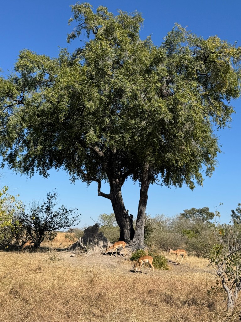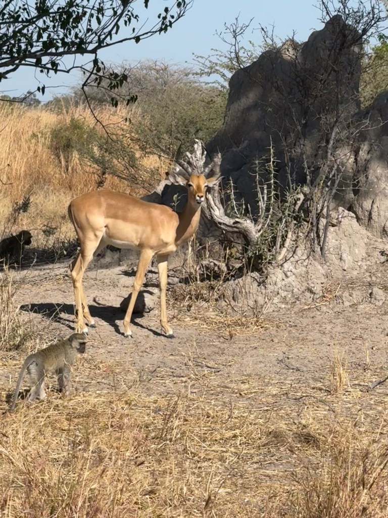 Monkeys are a messy breed–at least the vervet monkeys are. While we were on Safari, we saw the omnivorous monkeys dining on berries in a tree. Below them were the gleeful impala, eating everything left behind. Sure, the impala could eat the surrounding grass, but it was delightful watching them supplement their diet with the berries that fell from the trees. In addition, the monkeys were in just the right spot as they were able to watch for any incoming predators. Thanks monkeys!
