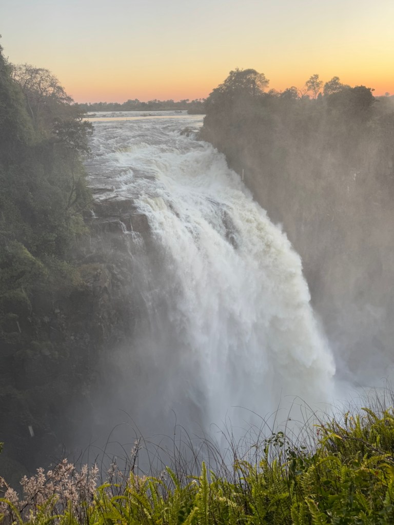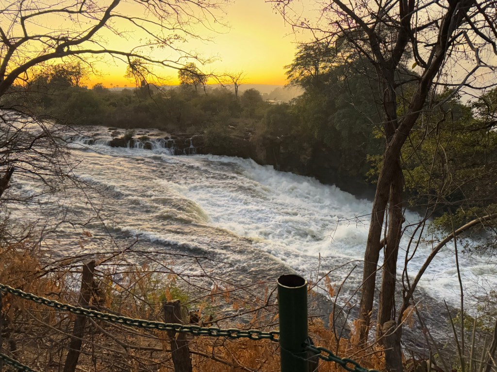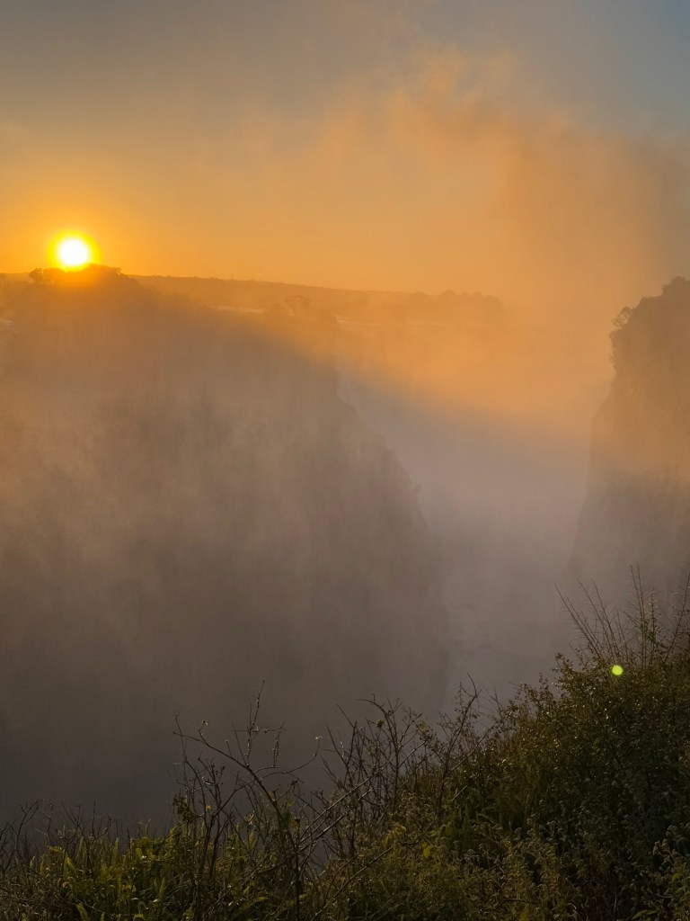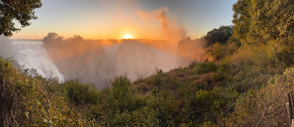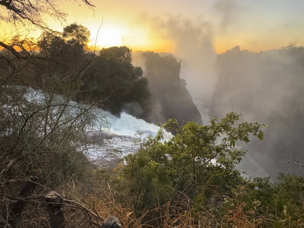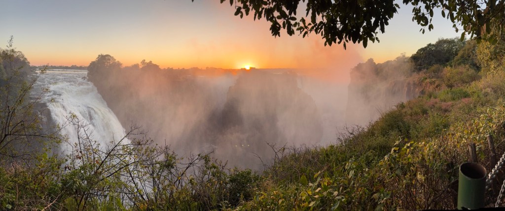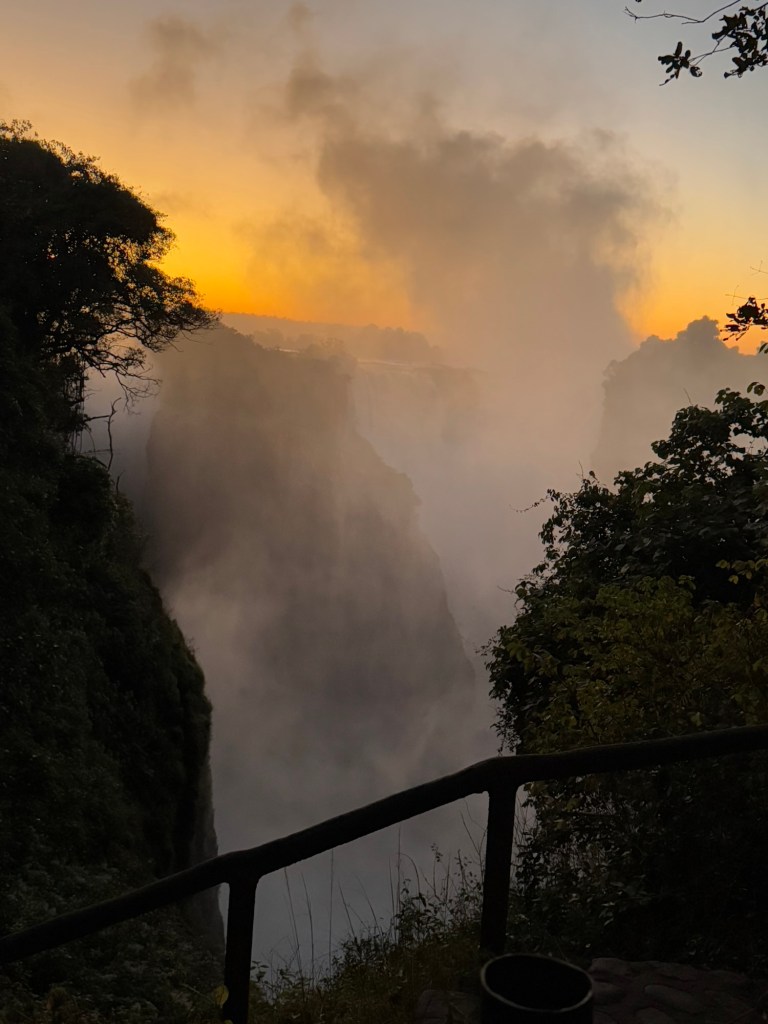 Our entrance into the Zimbabwe side of Victoria Falls occurred at 6:00AM, so we could experience the Falls with fewer people. It also gave us the opportunity to watch the sunrise over the falls. As exhausting as it was to wake before the hotel began breakfast service, witnessing a sunrise over one of the seven wonders was incredible.