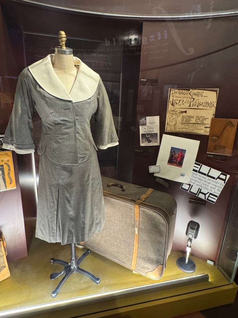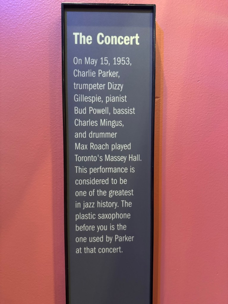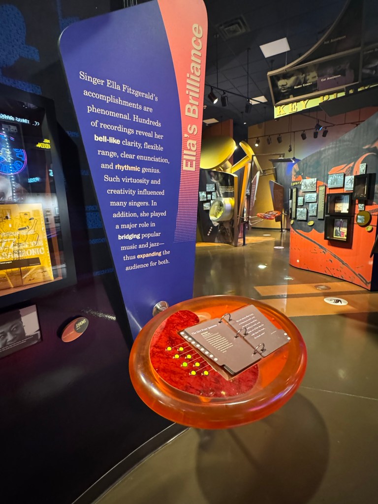 I separated the museum into sections. The first section, biographies, introduced the experience through well-known performers. Artists such as Charlie Parker, Louis Armstrong, Duke Ellington, and Ella Fitzgerald encompassed the area. Artifacts, songs, bios, and photos lit up the room. Each artist had a stand with a book made of plastic pages. Each page was numbered, and a button with the corresponding number sat beside the book. Once you pressed the button, the page was read. Sometimes songs spread throughout the room. The combination of music and information provided a balanced experience.