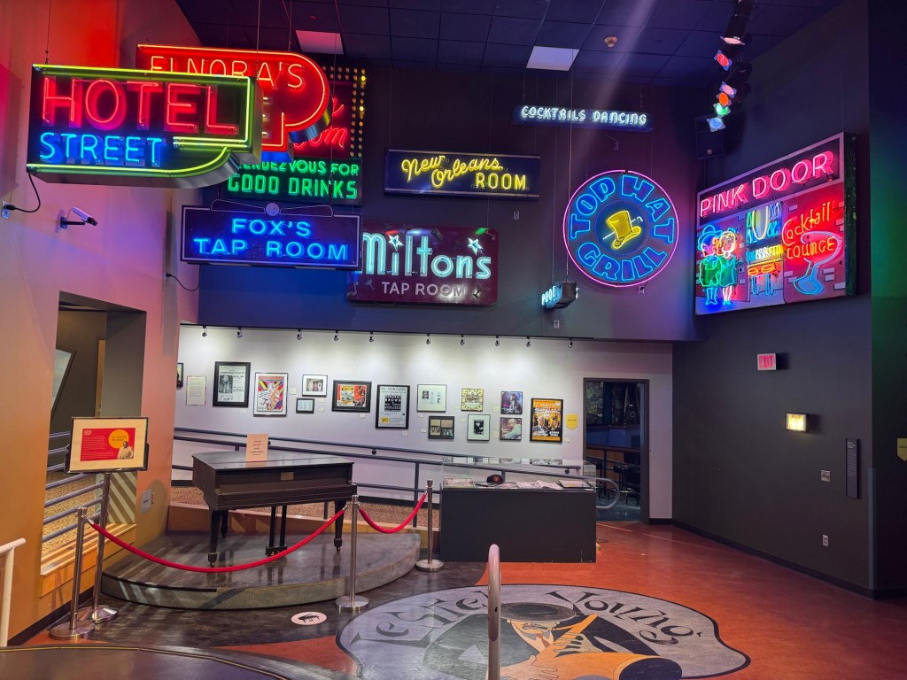 The final section shows jazz in life. An eight track machine, records, movies…Jazz quickly encompassed American lives, and it still entertains today. Throughout this third section, you watch movies or look to the neon signs. Each item helps you see the importance of this art form that grew in prominence, starting in New Orleans and spreading to places like Kansas City.