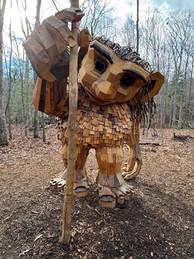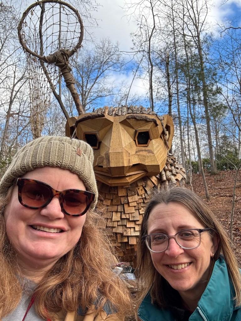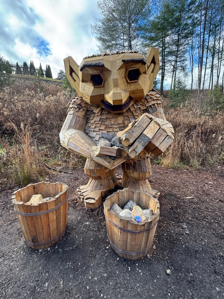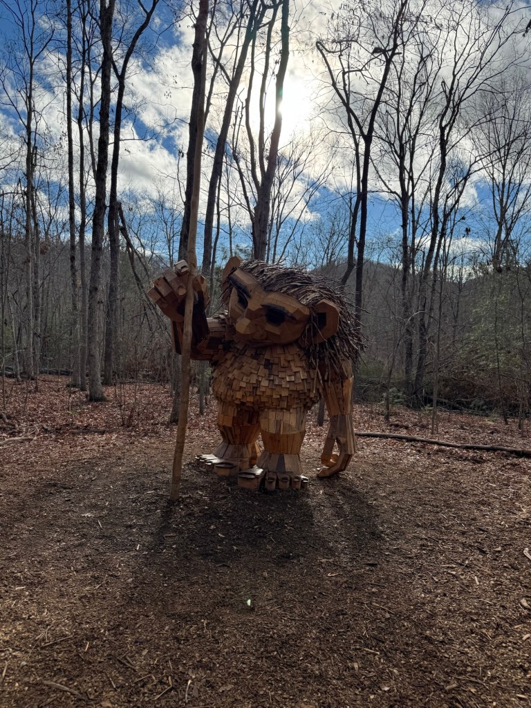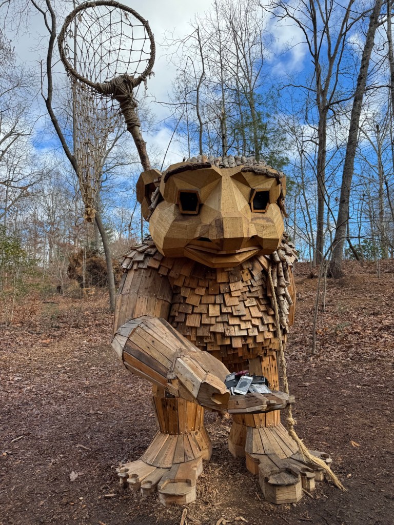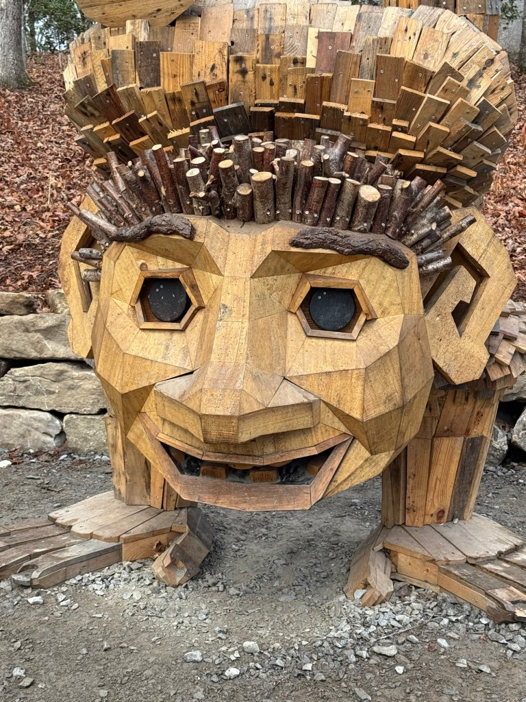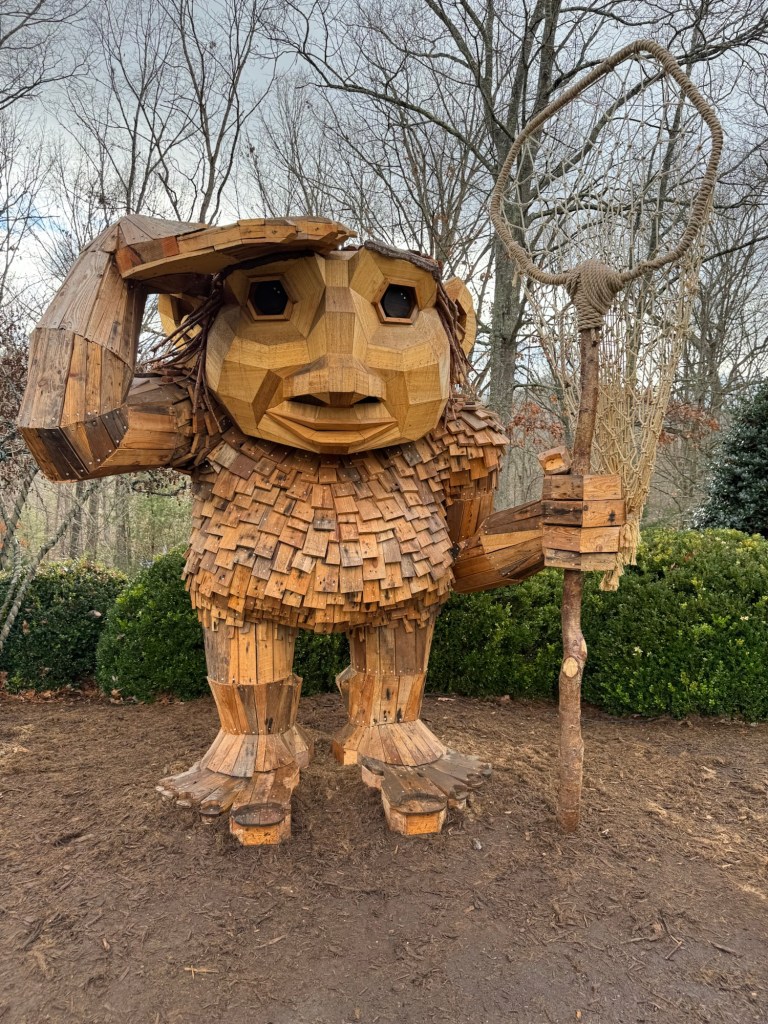 Before I begin, let’s learn the back story for these trolls. The 12 trolls displayed here travel approximately every six months. I believe they began in Europe before their official US premiere in Asheville. Their stay at the NC Arboretum concludes February 17, 2026, so if you want to see them on the east coast…hurry. Otherwise , you’ll have to wait until they travel to Southern California for their next tour.