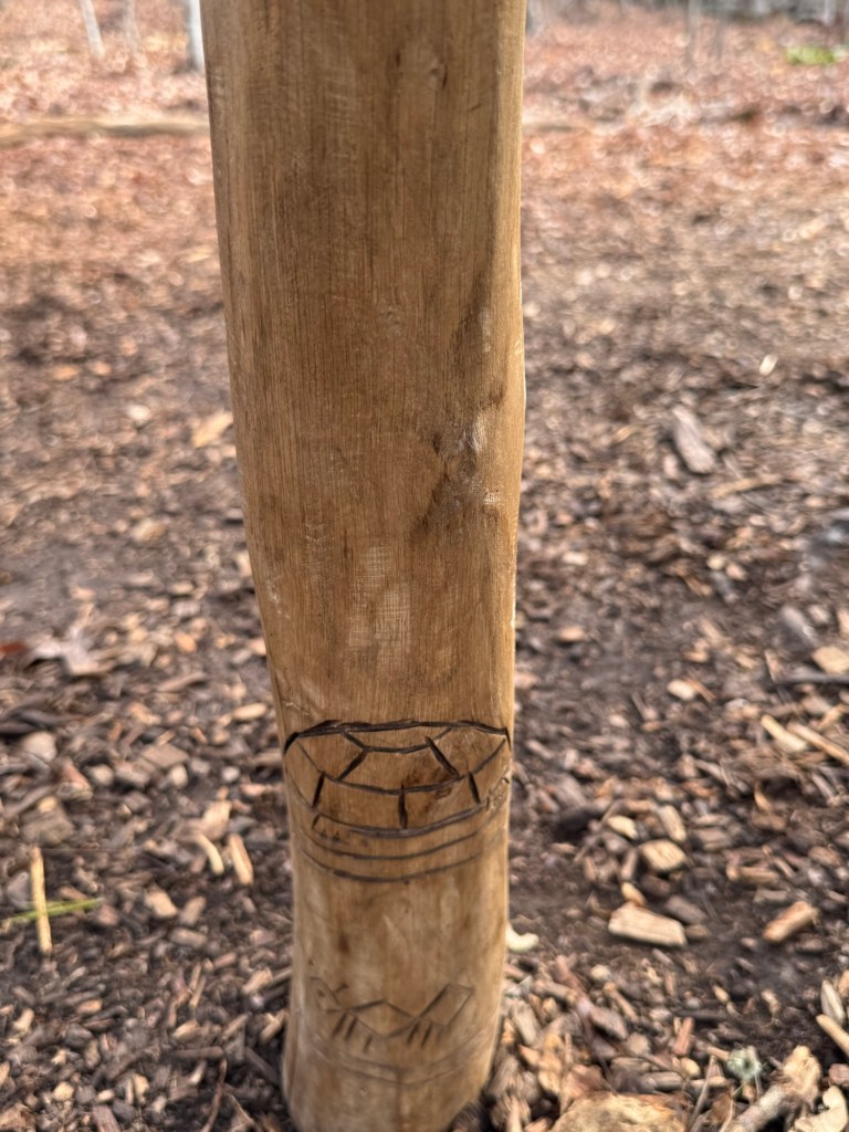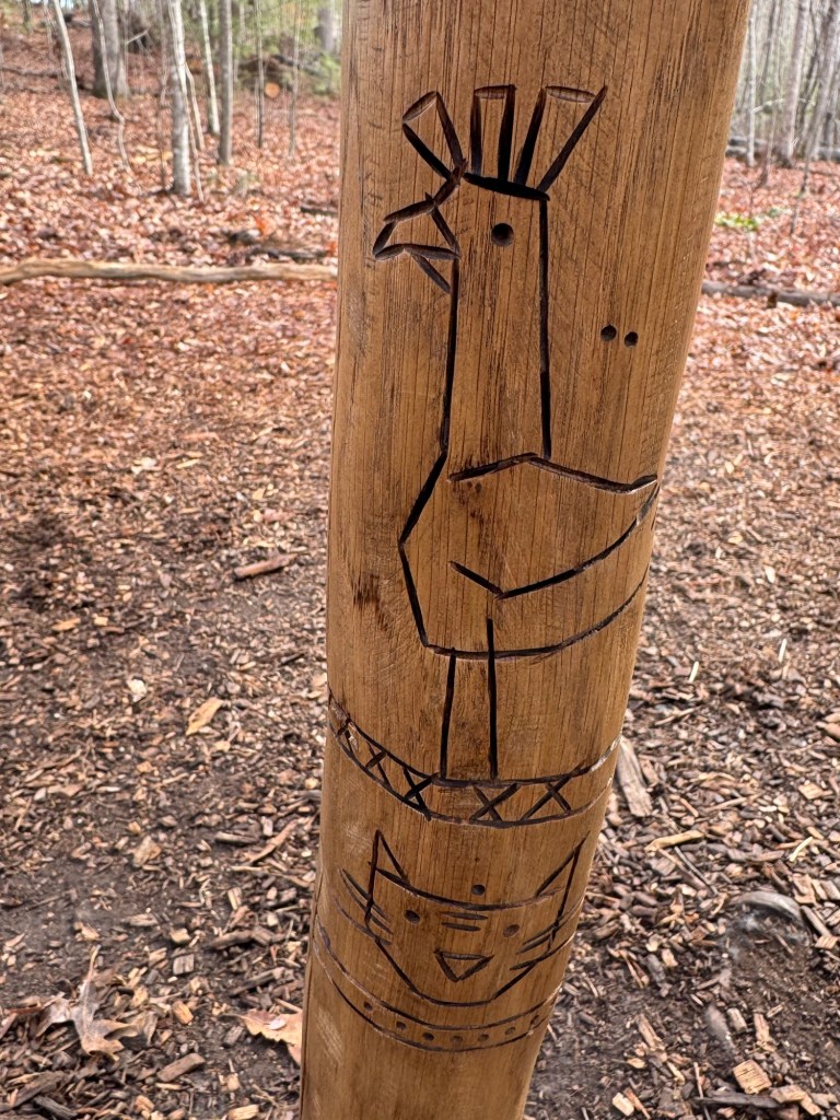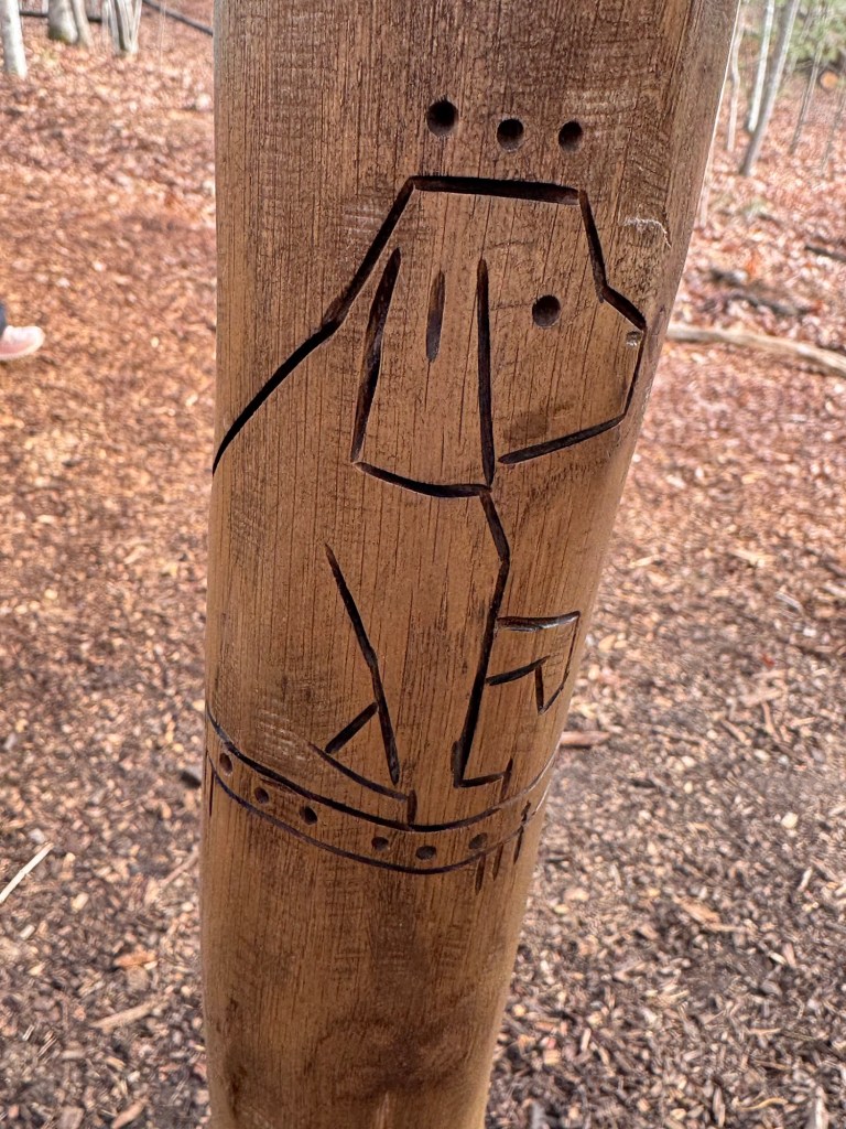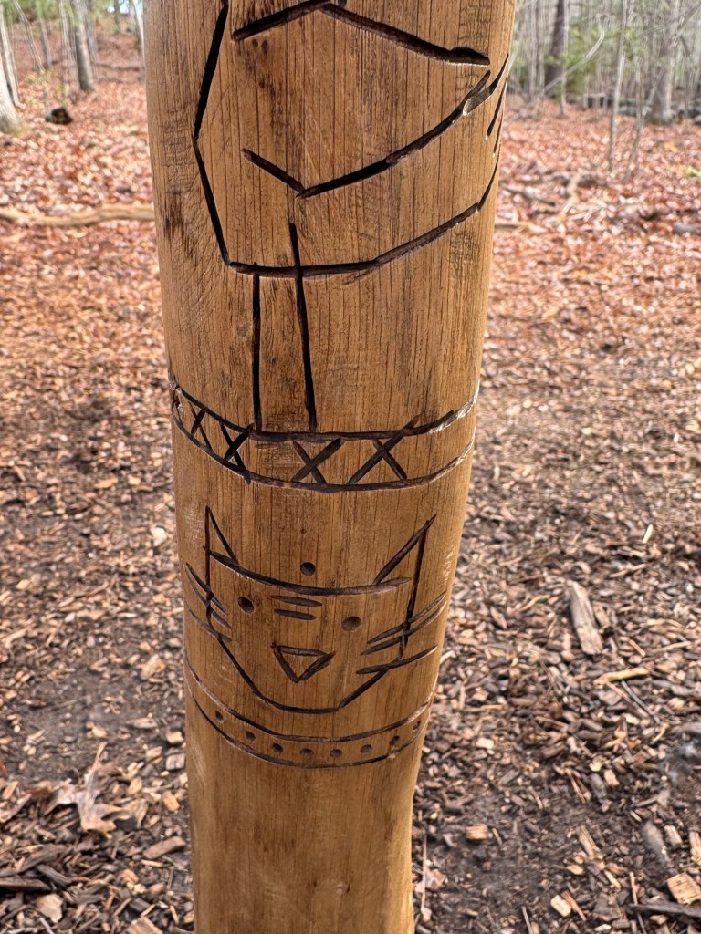 Birch held a stick with beautifully carved creatures. It was fun to see the details Dambo put into this troll. I particularly loved the saber tooth tiger. Near the arboretum, but on her own path was…