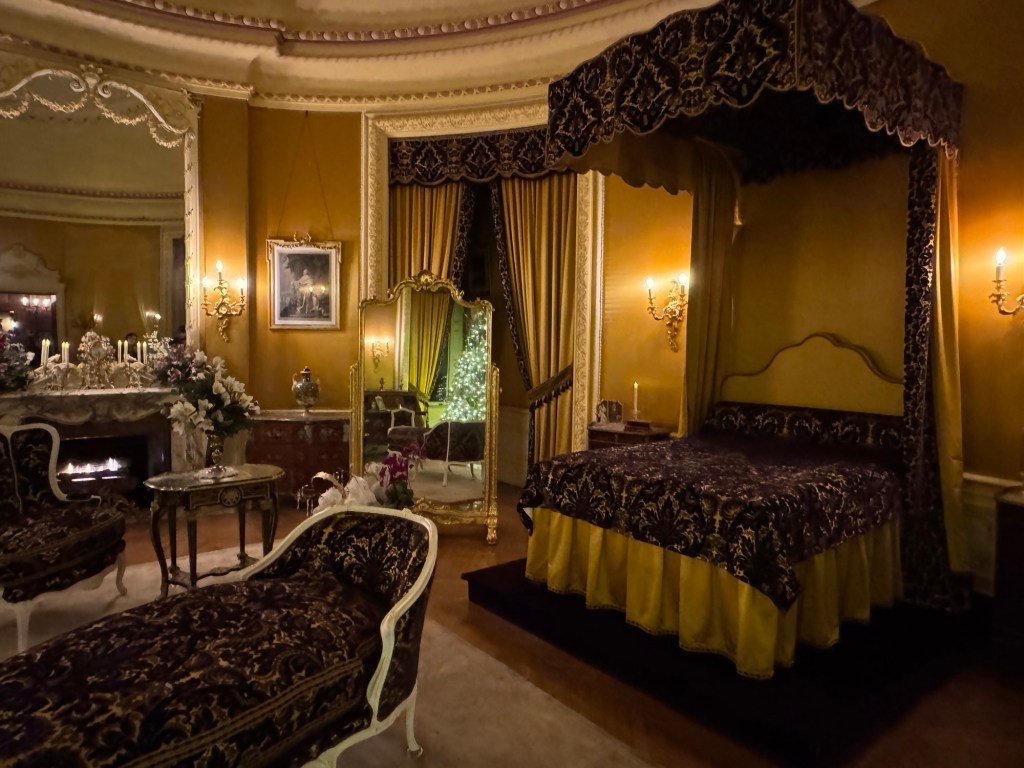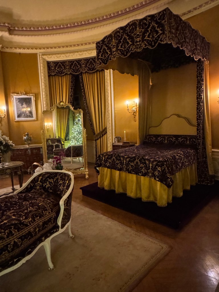 Edith’s oval shaped room has a vibrant, feminine touch with yellow lampas silk walls surrounding the living space. You could tell the attention to detail mattered, and the room felt joyful.