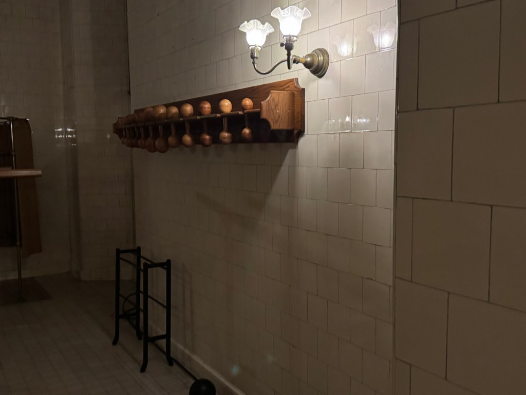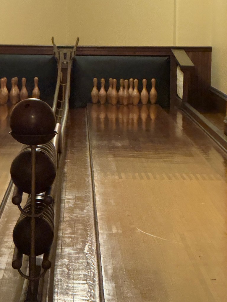 Often the family and guests would choose to bowl. Servants would stand by the pins, ready to set them up when needed. Bowlers would hurl their bowling ball down one of two lanes with the hope of a strike.