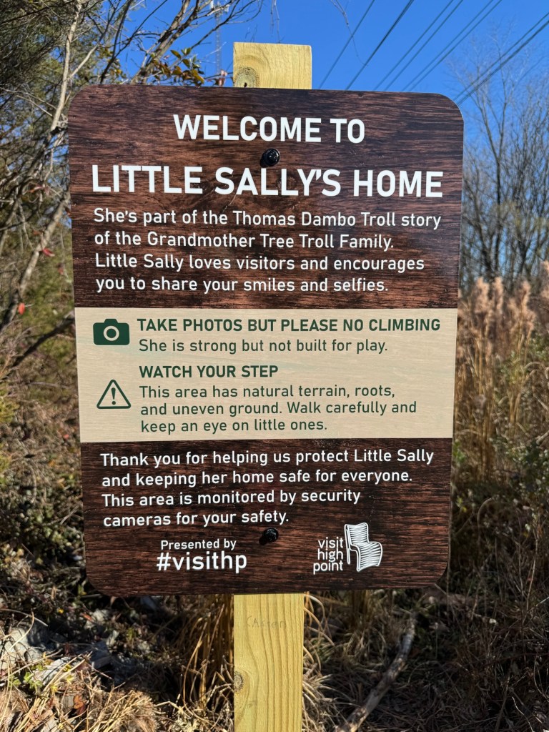As for Sally, she arrived on the scene in 2025. The trollmap has not been updated with her story. Someday soon installation of the QR code sign will occur…not yet though. However, there are a few things I know. Sally’s hair is made of furniture legs. Why? Apparently, High Point is the “Home Furnishings Capital of the World”. Over 100 furniture stores and outlets make their home in High Point. Had I done enough research on the city (sorry I was hyperfocused on trolls), we would have visited the World’s Largest Chest of Drawers. Standing at 36 feet, the dresser lovingly displays colorful socks. Sadly, this amazing visual escaped my inspection.