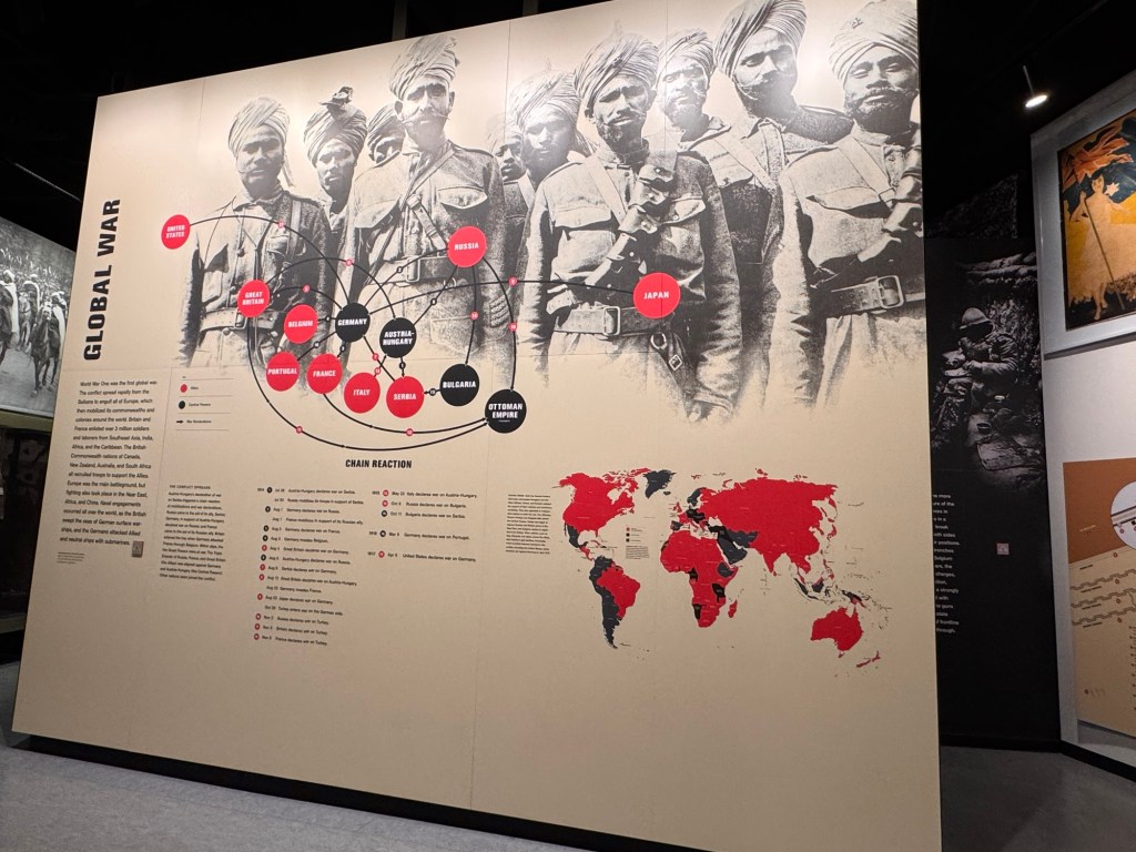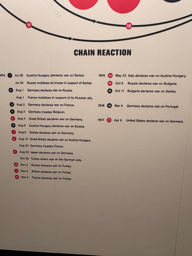 Thankfully, the museum provides exceptional videos and displays that help visitors gain a deeper understanding of the war. One theme that likely finds itself in the midst of most wars is power. People or countries always want the upper hand. If someone is seen to have a greater advantage, it doesn’t seem like much time will transpire before someone challenges that power. In the case of WWI, Britain (and France) had quite the power though it was labeled imperialism. These two countries not only formed an alliance, but they also controlled the seas and owned most of the colonies around the world. That created distrust and fear amongst the other countries; particularly Germany.