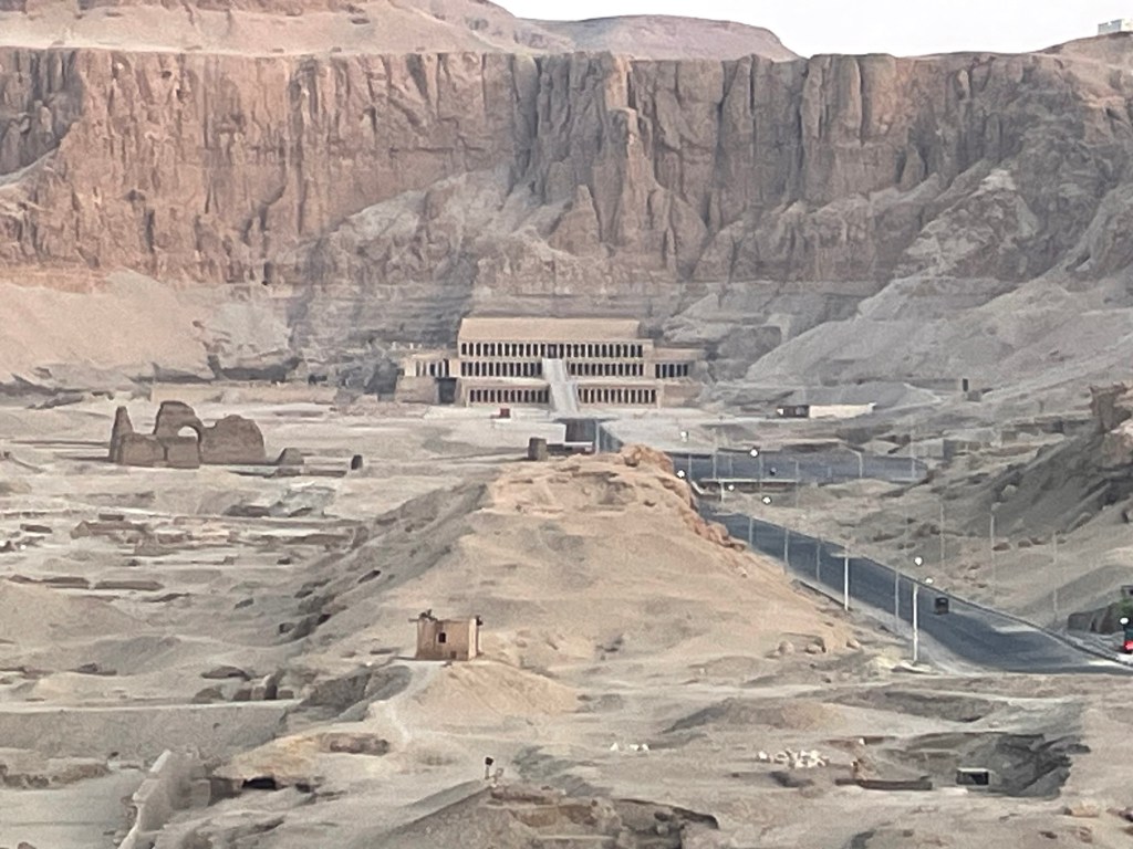 Eventually, the sun began to rise, and I looked around. I witnessed the majestic Hatshepsut Temple. When I toured it on land, I felt its immense size, but as I flew past, I recognized that even the largest structures pale in comparison to the size of Earth. I also looked directly below and other buildings just zoomed by.