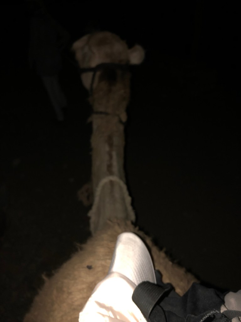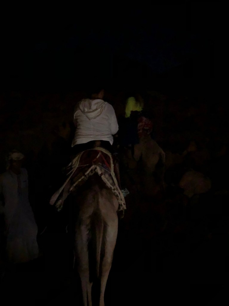 When we arrived at the base of the mountain, it was dark. Our guides and drivers walked with us in the silence, but I’ll admit the only thing I knew was we’d find camels and begin. That process proved to be a little unnerving, for as we walked, we were flanked by the bedouin people. First, we were walking alone in silence…then multiple feet walked in step with us. I heard them before I saw them, and that takes talent!