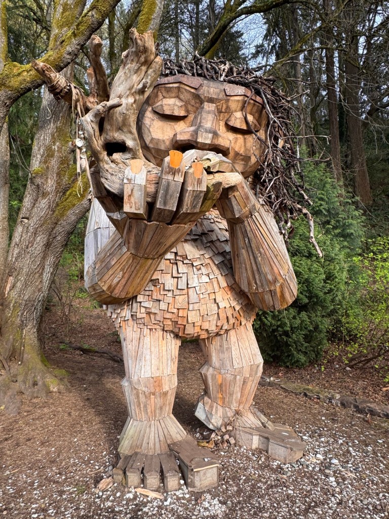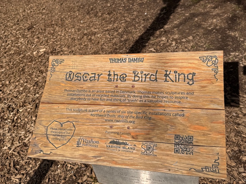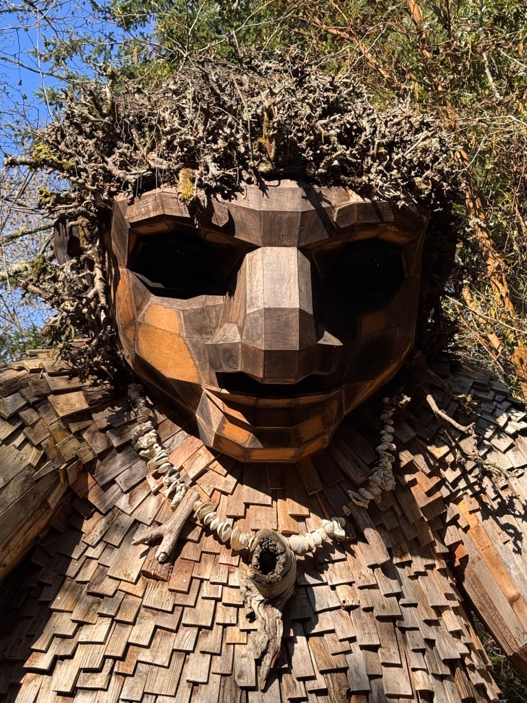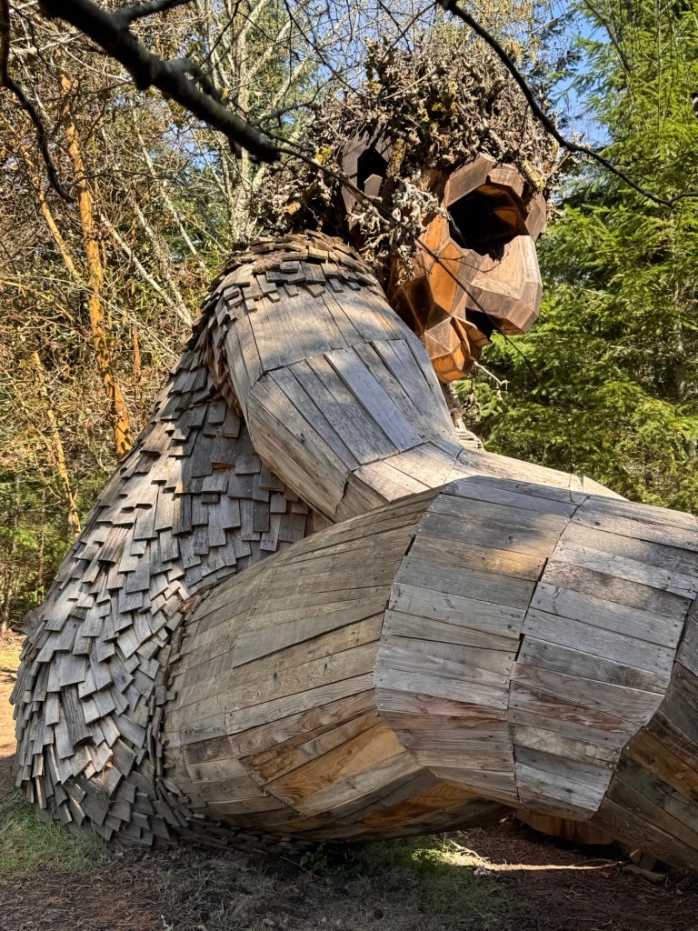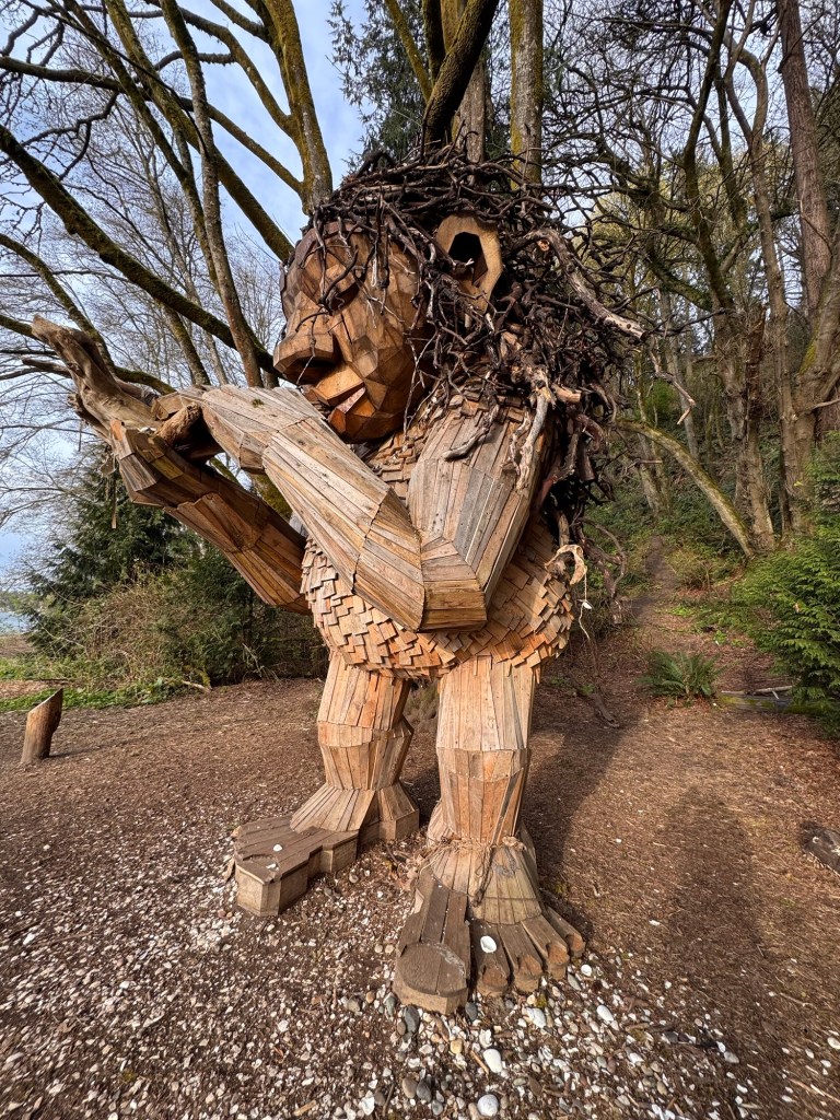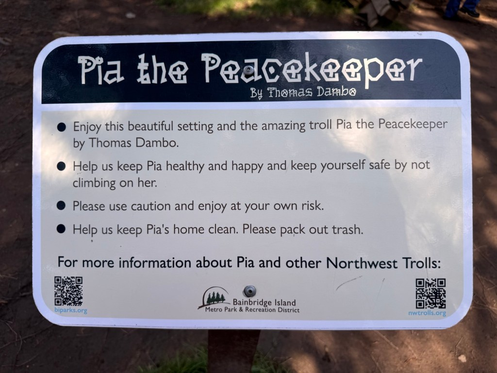 My first stop on Bainbridge Island included Pia the Peacekeeper. Standing, well sitting, at 18 feet tall, Pia is part of the “Way of the Bird King Project.” As all Dambo trolls have a message, Pia represents peace, environmental awareness, and community. In fact, she sits across the street from a high school at Sakai Park, and part of her construction team included the local cub scouts. If you’d like to watch a time lapse of Pia’s construction, click here. Otherwise, I have some photos for you.