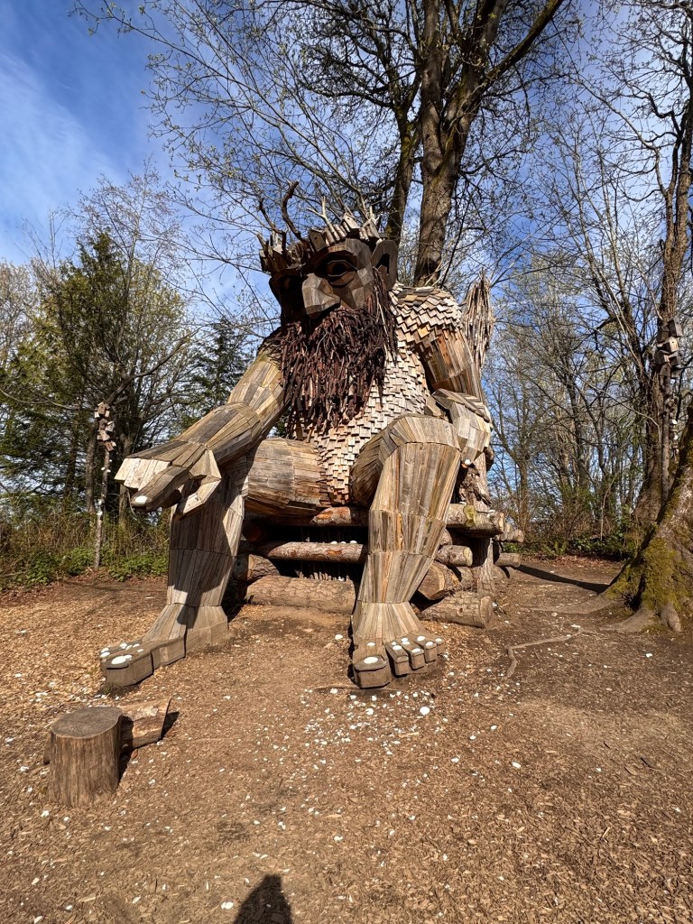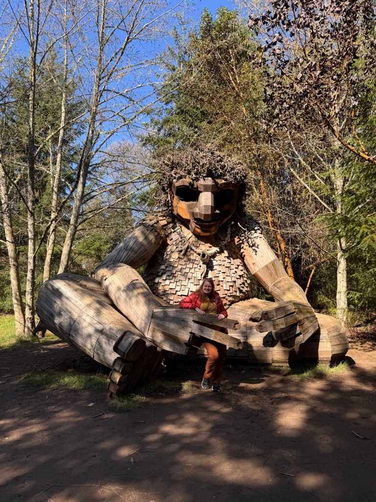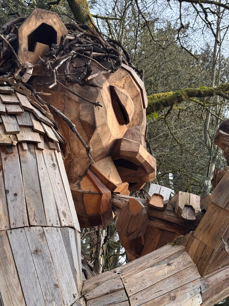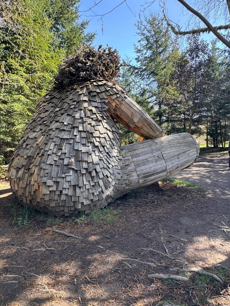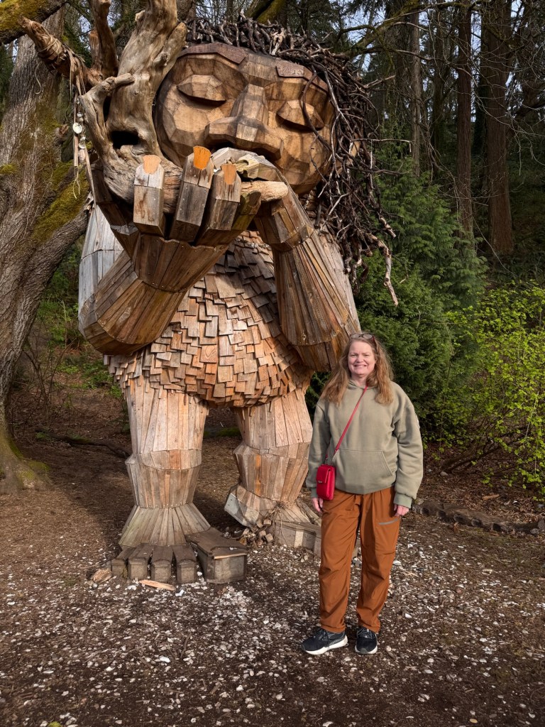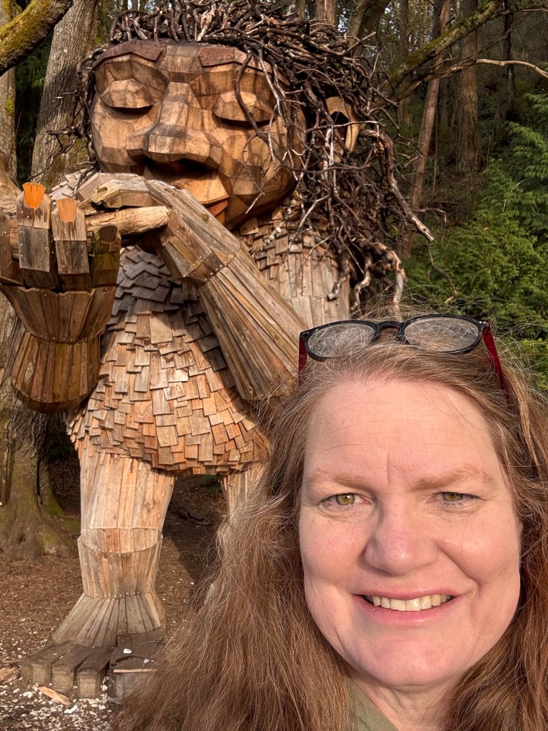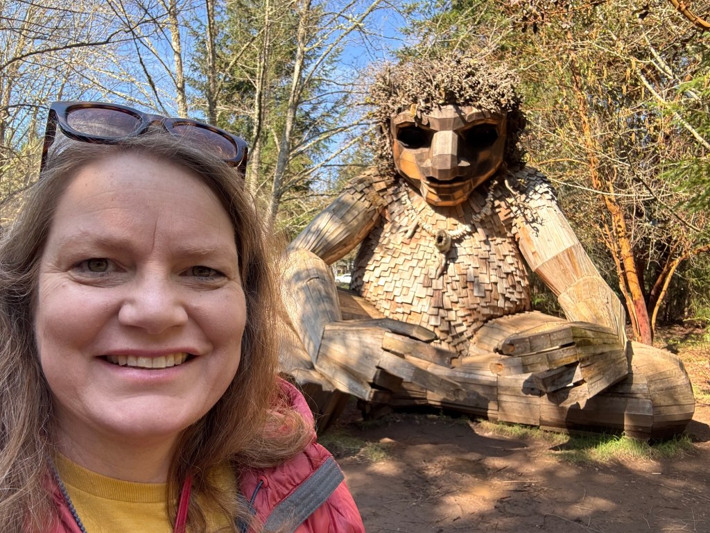 My first stop on Bainbridge Island included Pia the Peacekeeper. Standing, well sitting, at 18 feet tall, Pia is part of the “Way of the Bird King Project.” As all Dambo trolls have a message, Pia represents peace, environmental awareness, and community. In fact, she sits across the street from a high school at Sakai Park, and part of her construction team included the local cub scouts. If you’d like to watch a time lapse of Pia’s construction, click here. Otherwise, I have some photos for you.