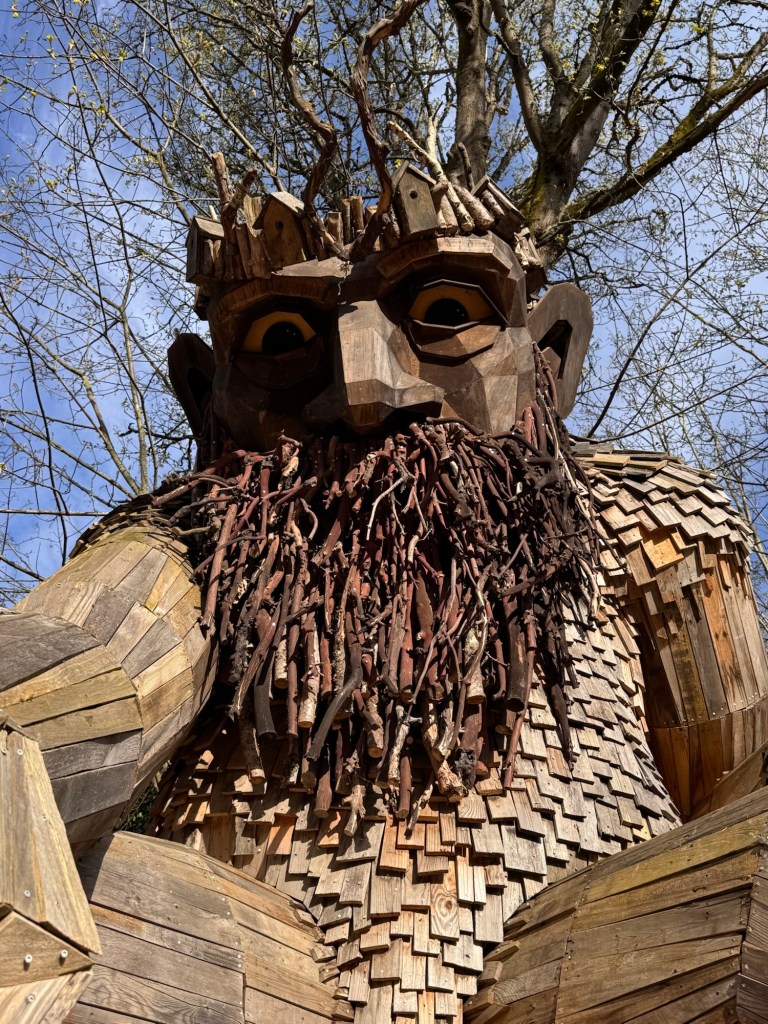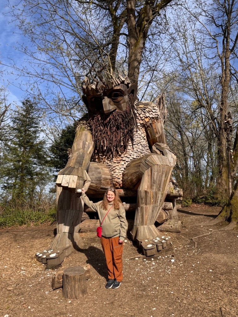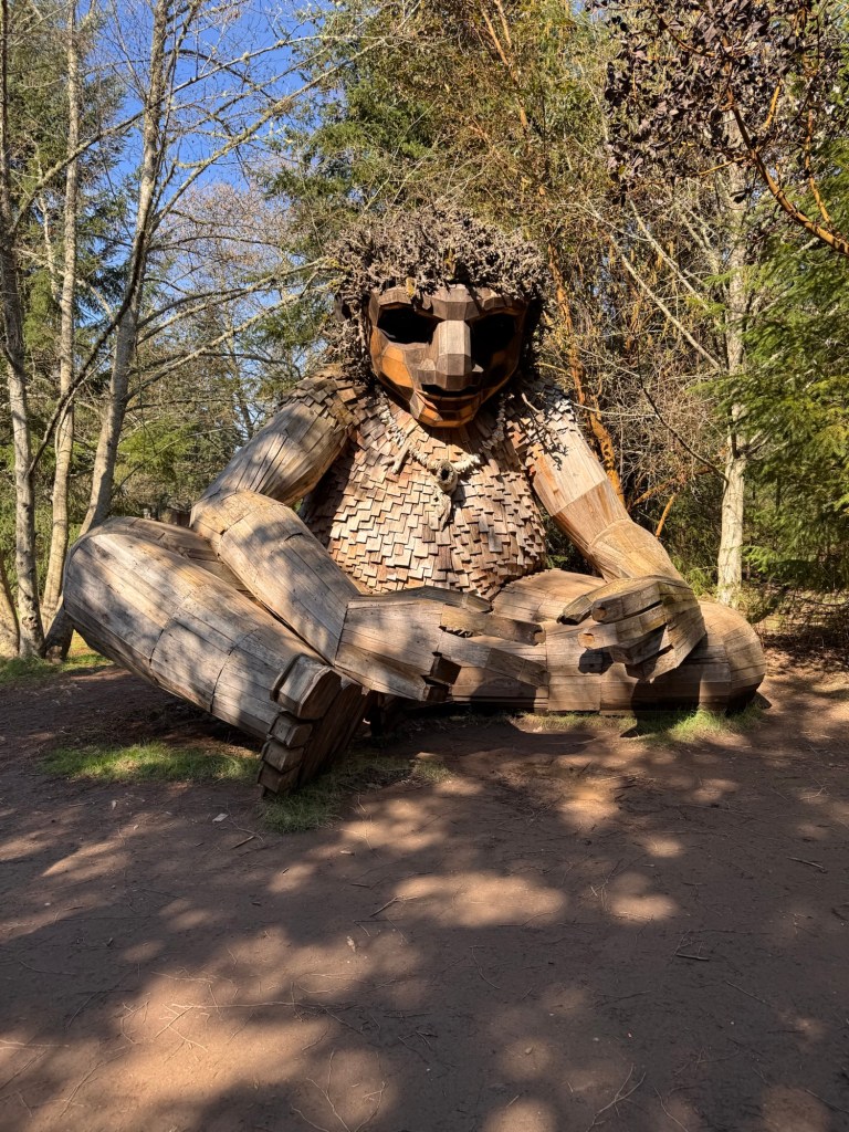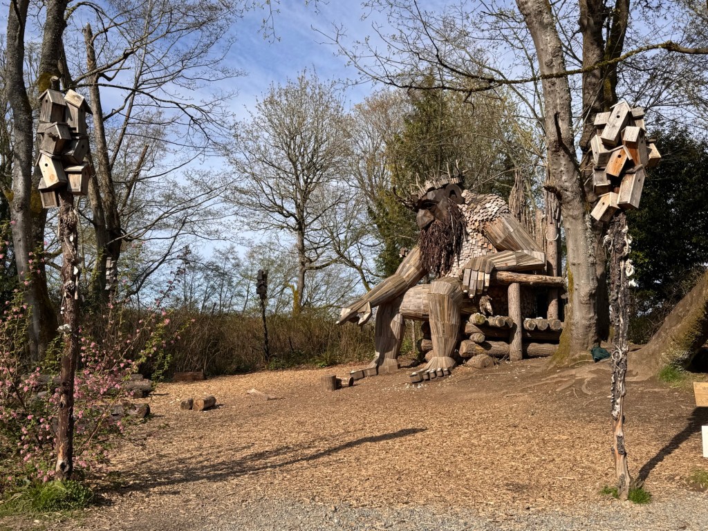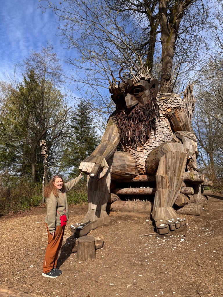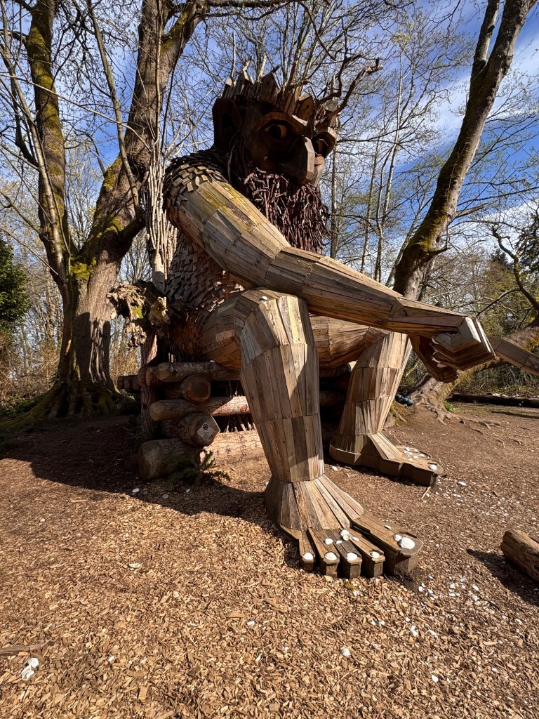My first stop on Bainbridge Island included Pia the Peacekeeper. Standing, well sitting, at 18 feet tall, Pia is part of the “Way of the Bird King Project.” As all Dambo trolls have a message, Pia represents peace, environmental awareness, and community. In fact, she sits across the street from a high school at Sakai Park, and part of her construction team included the local cub scouts. If you’d like to watch a time lapse of Pia’s construction, click here. Otherwise, I have some photos for you.