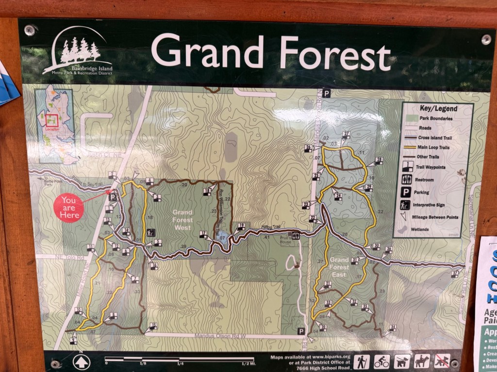 Grand Forest sits on 240 acres and has three sections: west, east, and north. I chose this hike because it had the feel of the Washington rainforests. The west and east trails connect and entertain more hikers than the north section, but I only encountered half a dozen people during my time. The hike was easy, and it had signposts to help me navigate.